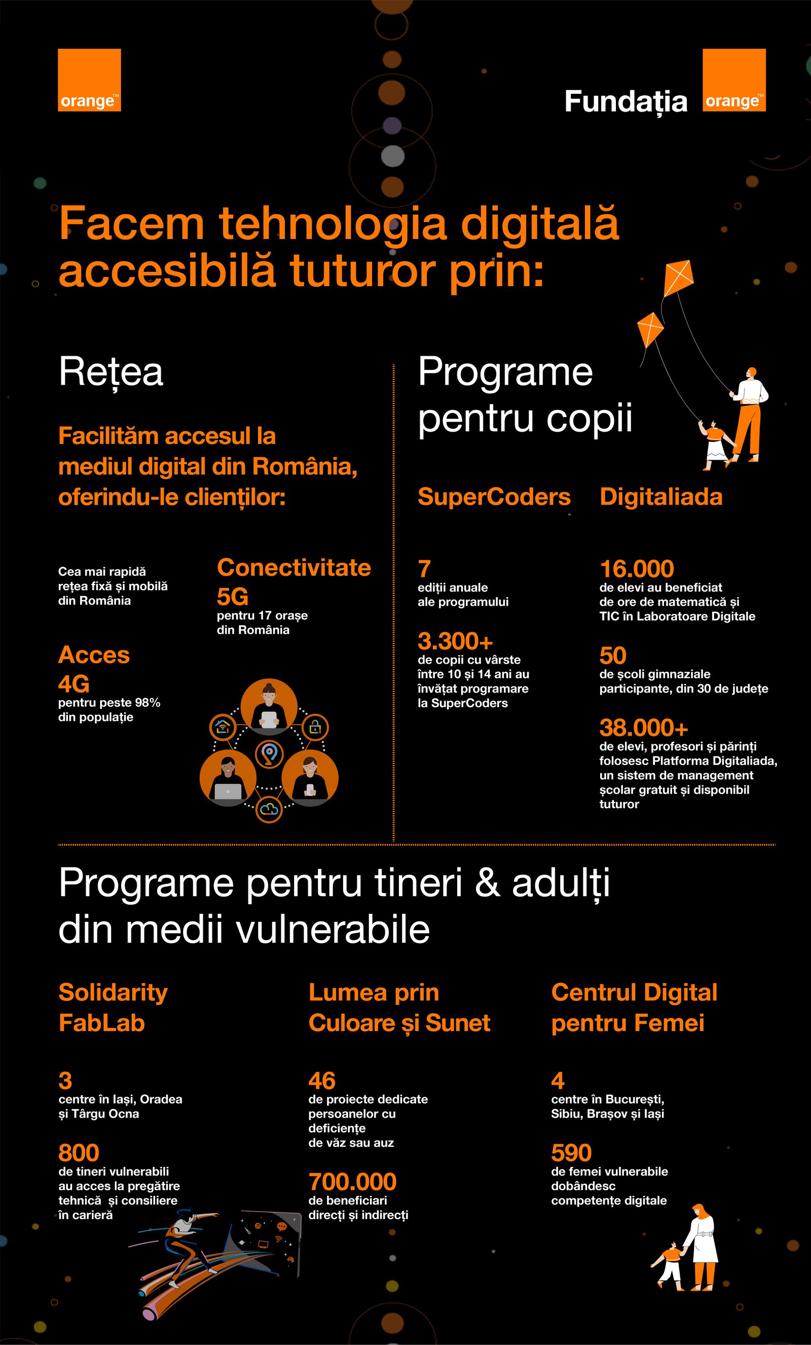 Campania Facem tehnologia digitală accesibilă tuturor vine în completarea eforturilor Orange și ale Fundației Orange de a facilita accesul la mediul digital din România, de la copii până la vârstnici. Încă din 2012, am construit o serie de programe care oferă acces românilor la oportunitățile pe care le aduce tehnologia și care schimbă în bine mii de vieți. Până în prezent, peste 710.000 de beneficiari au avut acces la programele noastre, iar această campanie duce mai departe eforturile de digitalizare pentru un impact pe termen lung. În plus, îmbunătățirea constantă a rețelei oferă clienților noștri cea mai rapidă rețea fixă și mobilă, precum și cea mai mare acoperire mobilă, fapt ce contribuie la obiectivele noastre de creștere gradului de acces la tehnologia digitală, a declarat Liudmila Climoc, CEO al Orange România
